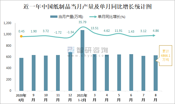 近一年中國紙制品當月產量及單月同比增長統計圖