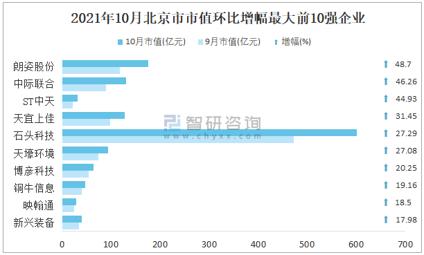 2021年10月北京市市值環比增幅最大前10強企業