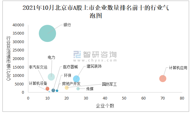2021年10月北京市A股上市企業數量排名前十的行業氣泡圖
