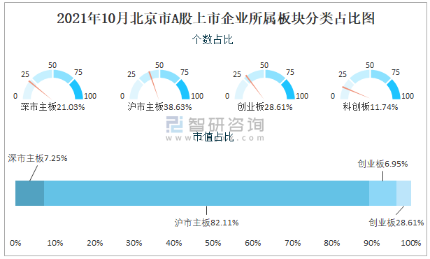 2021年10月北京市A股上市企業所屬板塊分類占比圖