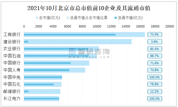 2021年10月北京市總市值前10企業及其流通市值