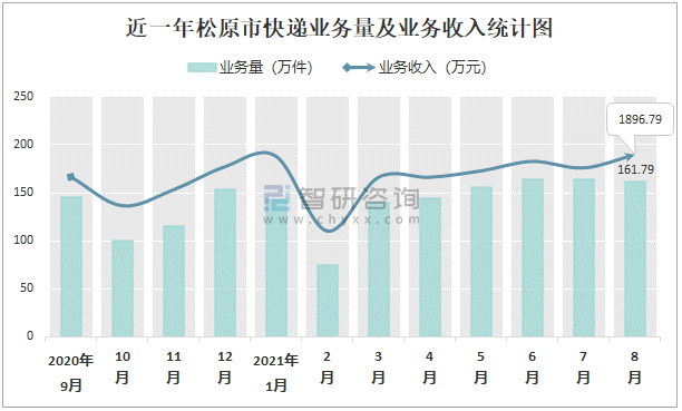 近一年松原市快遞業務量及業務收入統計圖