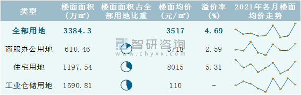 根據國信房地產信息網數據統計可知:2021年9月成都市全部用地出讓地面均價為13385元/㎡,其中住宅用地出讓地面均價最高(14936元/㎡),全部用地成交地面均價為13717元/㎡,其中住宅用地成交地面均價為17045元/㎡,高于商服辦公用地成交地面均價;2021年1-9月成都市工業倉儲用地樓面面積占其全部用地比重最多,為47.01%。