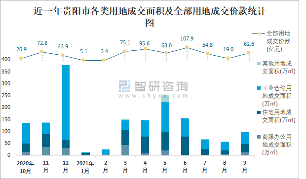 近一年貴陽市各類用地成交面積及全部用地成交價款統(tǒng)計圖