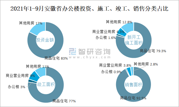 2021年1-9月安徽省辦公樓投資、施工、竣工、銷(xiāo)售分類(lèi)占比