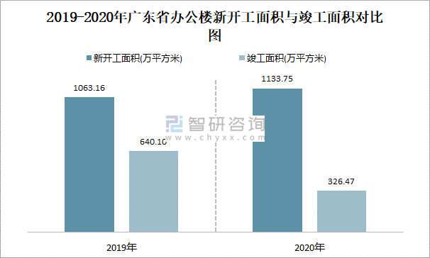 2019-2020年廣東省辦公樓新開工面積與竣工面積對比圖