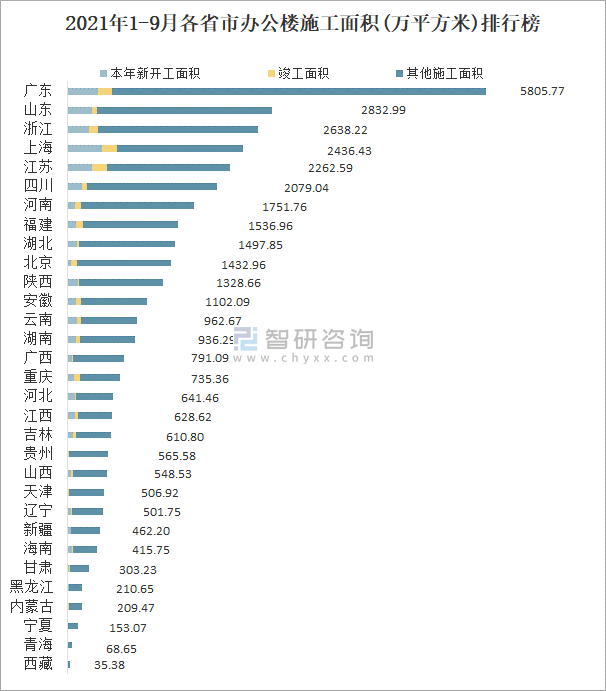 2021年1-9月各省市辦公樓施工面積(萬平方米)排行榜