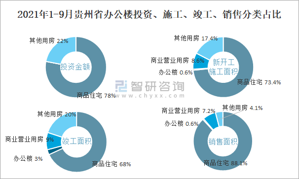 根據國家統計局數據統計可知:2021年1-9月貴州省房地產開發企業在包括辦公樓在內的其他用房投資金額占比為22%(注:只有投資金額中其他用房包含辦公樓、商業營業用房),辦公樓的新開工面積與竣工面積所占比重差異不大,從銷售面積來看,辦公樓銷售面積占比少于商業營業用房銷售面積占比。
