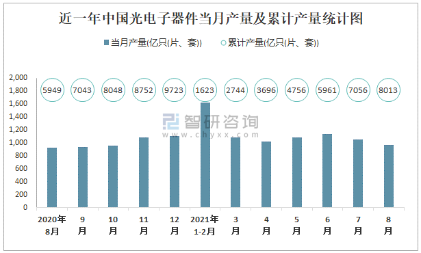 2021年1-8月中國光電子器件產(chǎn)量為8012.5億只(片、套) 累計增長36.2%