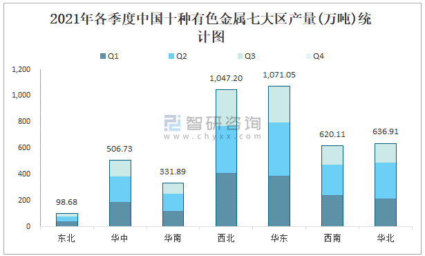 2021年各季度中國十種有色金屬七大區產量統計圖