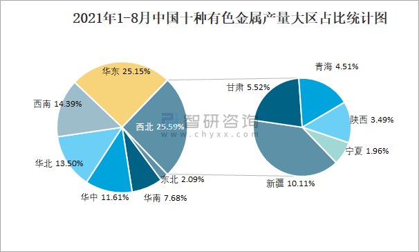 2021年1-8月中國十種有色金屬產量大區占比統計圖
