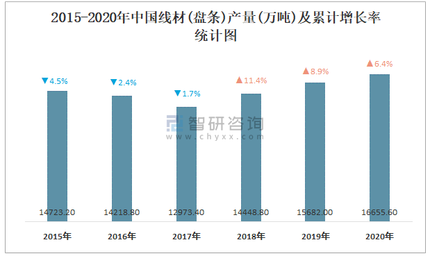 2015-2020年中國線材(盤條)產量及累計增長率統計圖