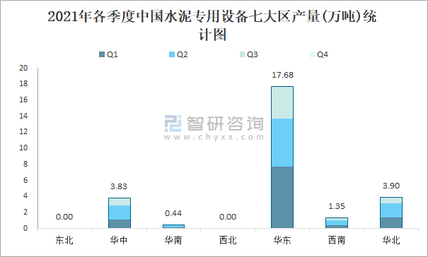 2021年各季度中國水泥專用設(shè)備七大區(qū)產(chǎn)量統(tǒng)計圖