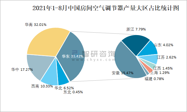 2021年1-8月中國房間空氣調節器產量大區占比統計圖