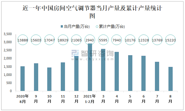 根據國家統計局數據顯示:2021年8月中國房間空氣調節器產量為1491萬臺,同比增長4.3%;2021年1-8月中國房間空氣調節器累計產量為15219.8萬臺,累計增長15.6%;2015-2020年中國房間空氣調節器產量2019年達到最高,次年小幅度下滑。