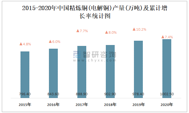 2015-2020年中國精煉銅(電解銅)產量及累計增長率統計圖