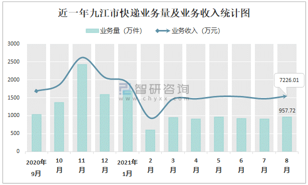 近一年九江市快遞業務量及業務收入統計圖