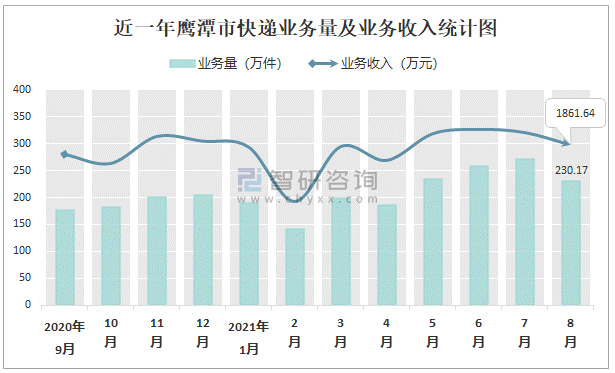 2021年8月鷹潭市快遞業(yè)務(wù)量與業(yè)務(wù)收入分別為230.17萬(wàn)件和1861.64萬(wàn)元