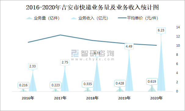 2016-2020年吉安市快遞業(yè)務(wù)量及業(yè)務(wù)收入統(tǒng)計圖