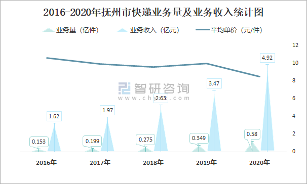 2016-2020年撫州市快遞業務量及業務收入統計圖