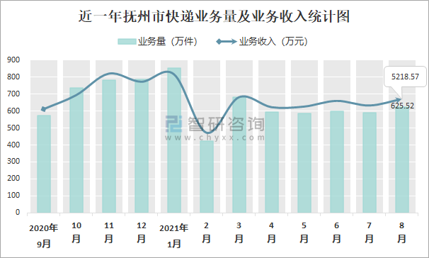 近一年撫州市快遞業務量及業務收入統計圖