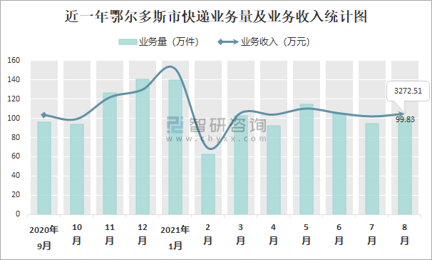 根據(jù)各省市郵政局?jǐn)?shù)據(jù)可知:2021年8月鄂爾多斯市快遞業(yè)務(wù)量為99.83萬件,業(yè)務(wù)收入為3272.51萬元;2021年1-8月鄂爾多斯市快遞累計(jì)業(yè)務(wù)量為810.56萬件,同比增長(zhǎng)44.49%,累計(jì)業(yè)務(wù)收入為26614.06萬元,同比增長(zhǎng)54.37%;2016-2020年鄂爾多斯市快遞業(yè)務(wù)量總體呈現(xiàn)上升趨勢(shì),業(yè)務(wù)收入逐年遞增,平均單價(jià)逐年遞增。