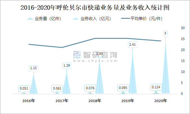 2016-2020年呼倫貝爾市快遞業務量及業務收入統計圖