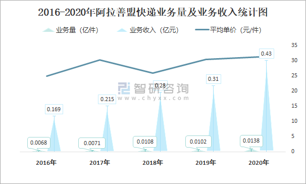 2016-2020年阿拉善盟快遞業務量及業務收入統計圖