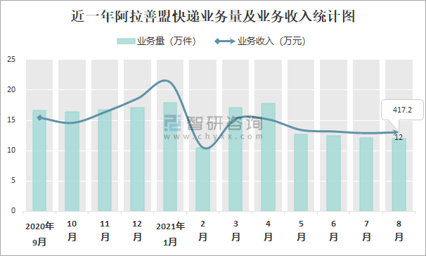 2021年8月阿拉善盟快遞業務量與業務收入分別為12萬件和417.2萬元