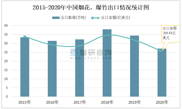 2015-2020年中國煙花、爆竹出口情況統計圖