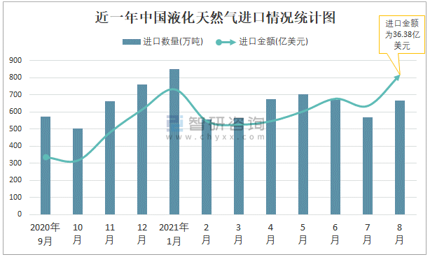 根據(jù)中國(guó)海關(guān)數(shù)據(jù)顯示:2021年8月中國(guó)液化天然氣進(jìn)口數(shù)量為665萬(wàn)噸,同比增長(zhǎng)12.7%,進(jìn)口金額為36.38億美元,同比增長(zhǎng)130.4%,2021年1-8月中國(guó)液化天然氣進(jìn)口數(shù)量為5181萬(wàn)噸,進(jìn)口金額為223.7億美元。