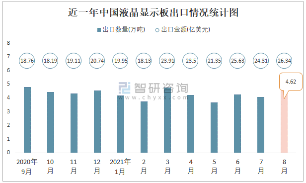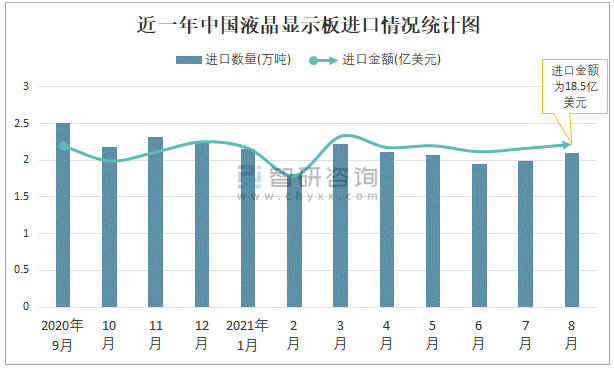 根據中國海關數據顯示:2021年8月中國液晶顯示板進口數量為2.1萬噸,同比下降15.1%,進口金額為18.5億美元,同比增長7.2%,2021年8月中國液晶顯示板出口數量為4.62萬噸,同比下降7.1%,出口金額為26.34億美元,同比增長42.7%;2021年1-8月中國液晶顯示板進口數量為16.4萬噸,進口金額為143.07億美元,出口數量為33.53萬噸,出口金額為183.12億美元。