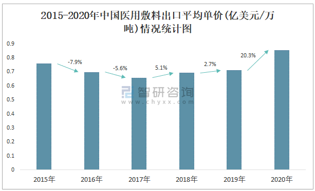 2015-2020年中國(guó)醫(yī)用敷料出口情況統(tǒng)計(jì)圖