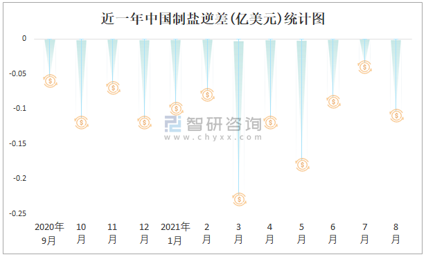 近一年中國制鹽逆差(億美元)統計圖