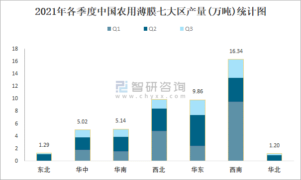 2021年各季度中國(guó)農(nóng)用薄膜七大區(qū)產(chǎn)量統(tǒng)計(jì)圖