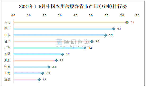 2021年1-8月中國(guó)農(nóng)用薄膜各省市產(chǎn)量排行榜