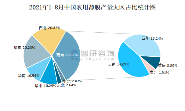 2021年1-8月中國(guó)農(nóng)用薄膜產(chǎn)量大區(qū)占比統(tǒng)計(jì)圖