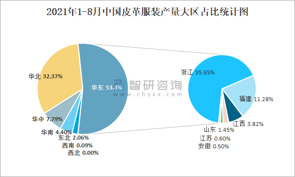 2021年1-8月中國皮革服裝產量為3054萬件 華東地區產量最高(占比53.3%)