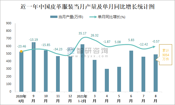 根據國家統計局數據顯示:2021年8月中國皮革服裝產量為491萬件,同比下降0.57%;2021年1-8月中國皮革服裝累計產量為3054萬件,同比增長3.77%;2015-2020年中國皮革服裝產量2016年達到最高,此后逐年遞減。