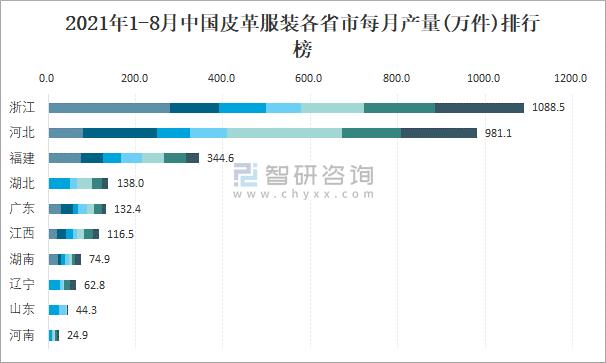 2021年1-8月中國皮革服裝各省市每月產量排行榜