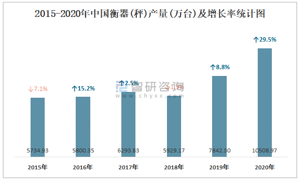 2015-2020年中國衡器(秤)產(chǎn)量及增長率統(tǒng)計圖