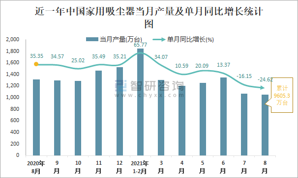 根據(jù)國家統(tǒng)計局?jǐn)?shù)據(jù)顯示:2021年8月中國家用吸塵器產(chǎn)量為1049萬臺,同比下降24.62%;2021年1-8月中國家用吸塵器累計產(chǎn)量為9605.3萬臺,同比增長16.98%;2015-2020年中國家用吸塵器產(chǎn)量逐年遞增,2020年達到最高。
