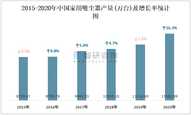 2015-2020年中國家用吸塵器產(chǎn)量及增長率統(tǒng)計圖