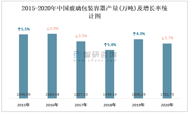2015-2020年中國玻璃包裝容器產量及增長率統計圖