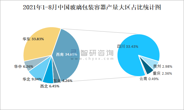 2021年1-8月中國玻璃包裝容器產量大區占比統計圖