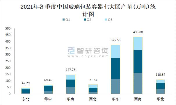 2021年各季度中國玻璃包裝容器七大區產量統計圖