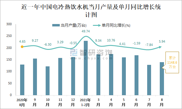 根據國家統計局數據顯示:2021年8月中國電冷熱飲水機產量為140萬臺,同比增長5.94%;2021年1-8月中國電冷熱飲水機累計產量為1148.6萬臺,同比增長7.92%;2015-2020年中國電冷熱飲水機產量總體呈現下降趨勢。