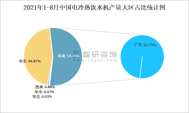 2021年1-8月中國電冷熱飲水機產量大區占比統計圖