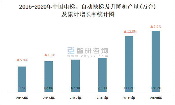 2015-2020年中國電梯、自動扶梯及升降機產量及累計增長率統計圖