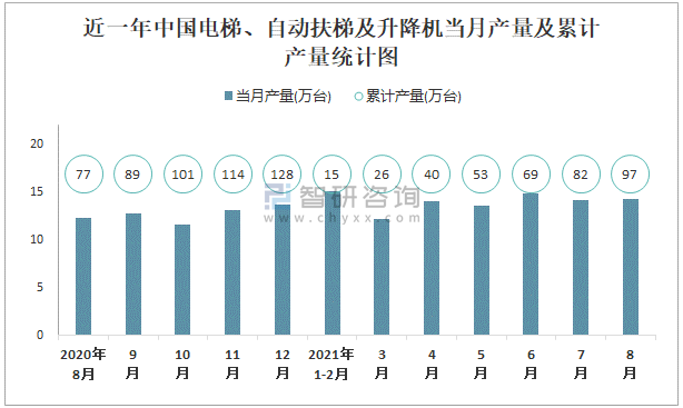 近一年中國電梯、自動扶梯及升降機當月產量及累計產量統計圖